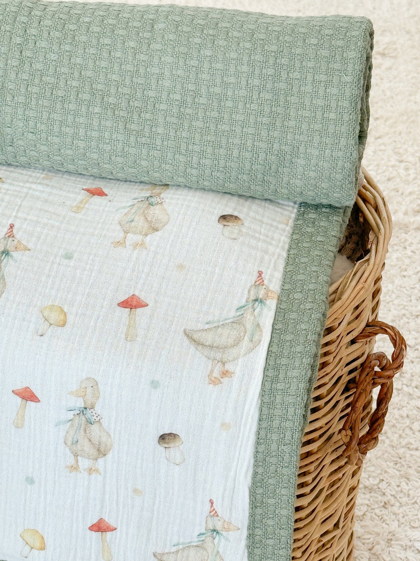 • One side features 100% cotton waffle, the other side is 100% cotton, 2-layer double gauze muslin — both breathable and baby-soft.
