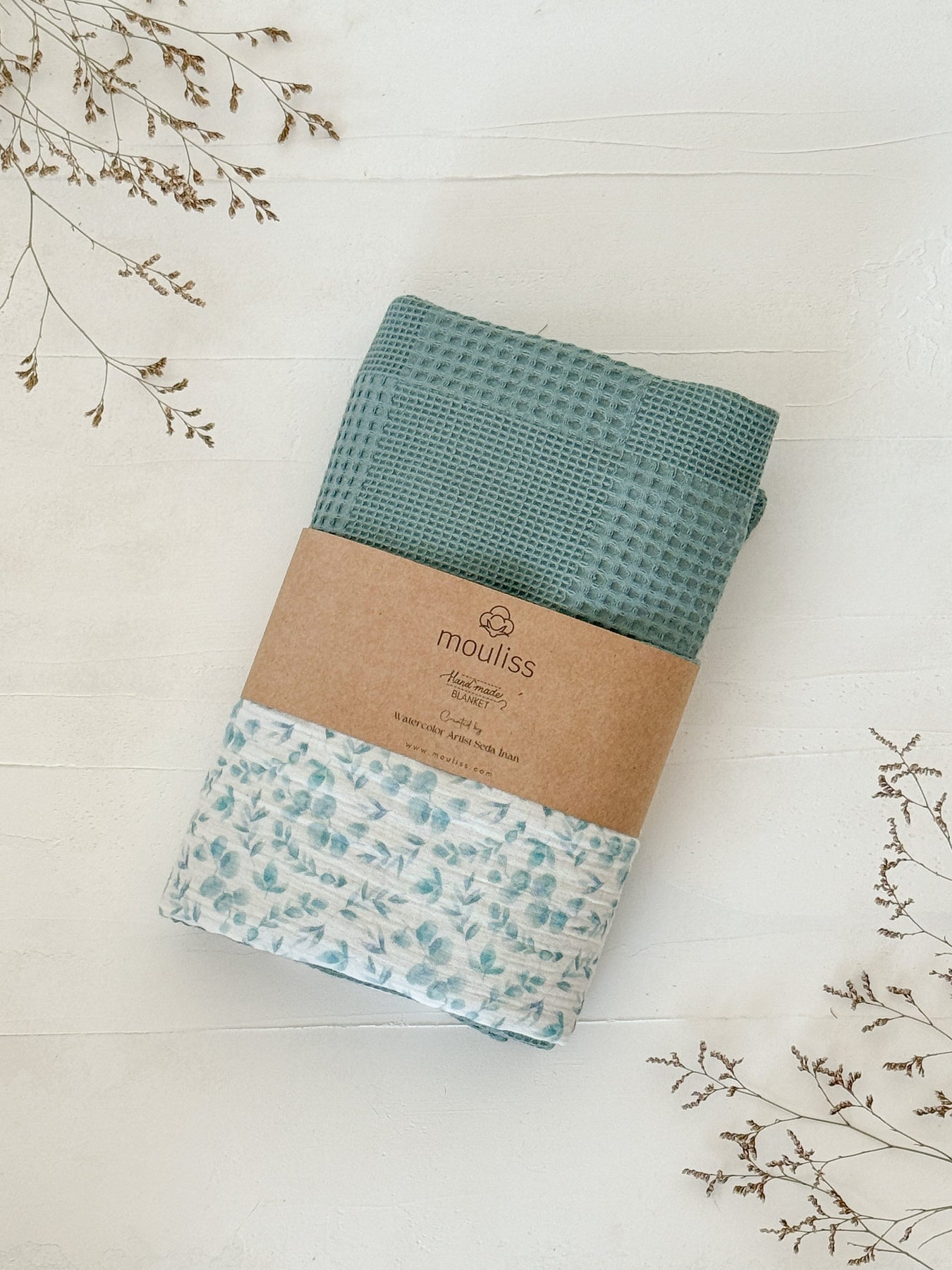 Baby blanket with eucalyptus pattern by Cotton, featuring a teal waffle knit reverse, folded on a white surface with dried floral sprigs.