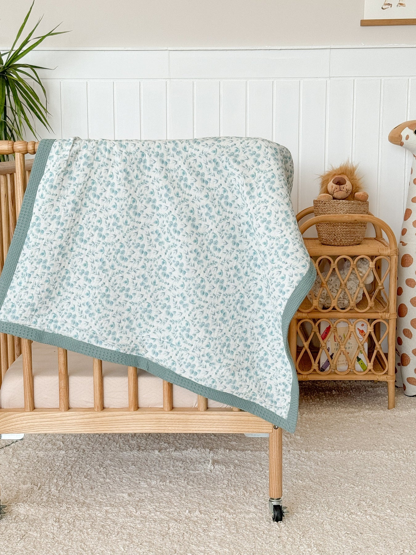 Personalized baby blanket from Cotton, featuring a light blue eucalyptus pattern on white with a teal waffle knit trim, draped over a wooden crib.