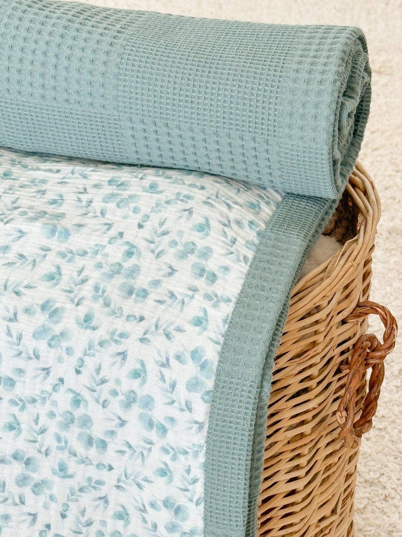 Personalized baby blanket with blue eucalyptus leaf pattern and teal waffle texture by Cotton, rolled up in a woven basket.