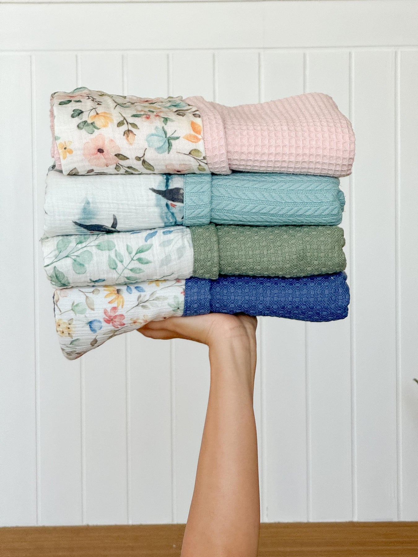• One side features 100% cotton waffle, the other side is 100% cotton, 2-layer double gauze muslin — both breathable and baby-soft.