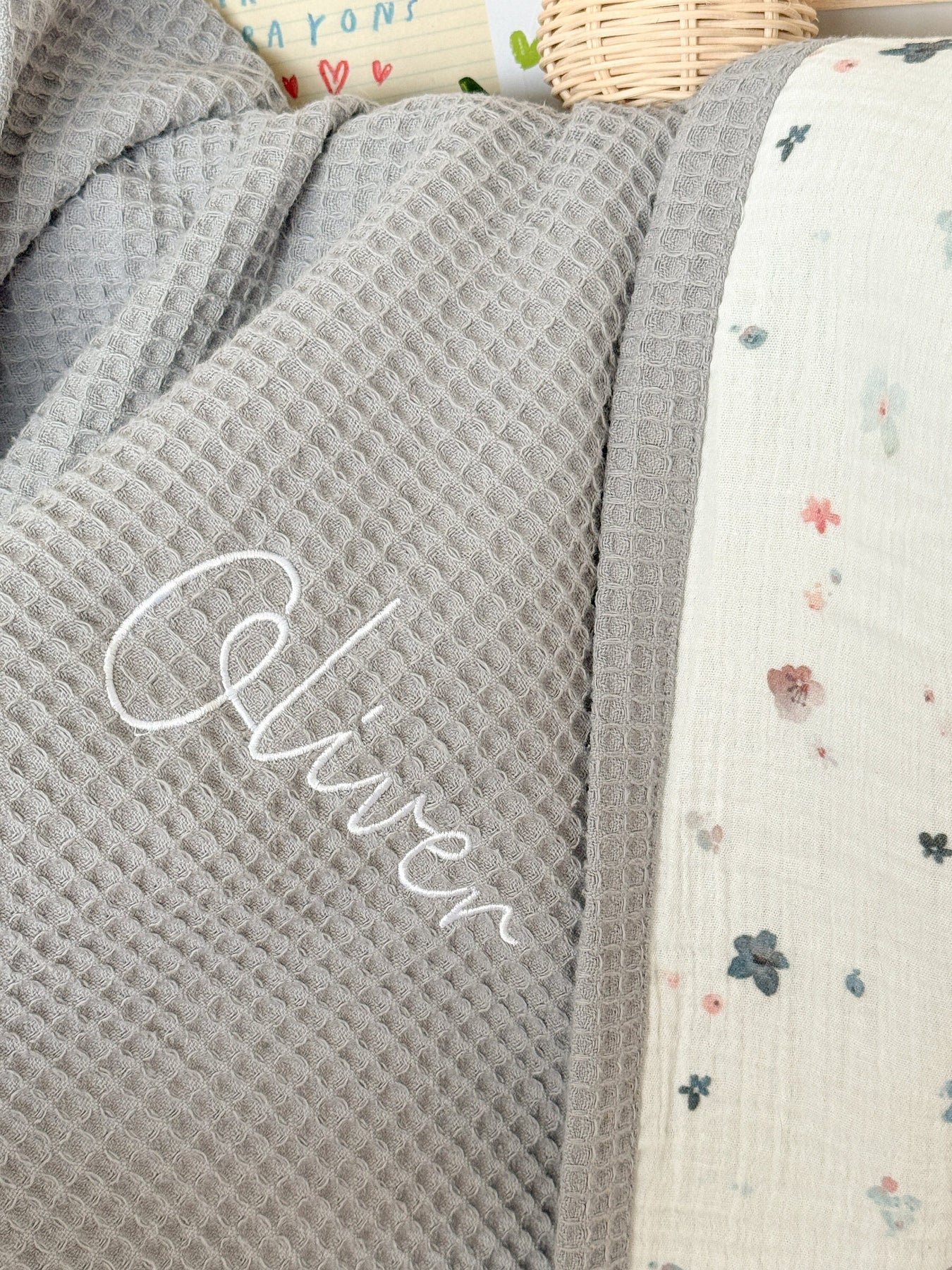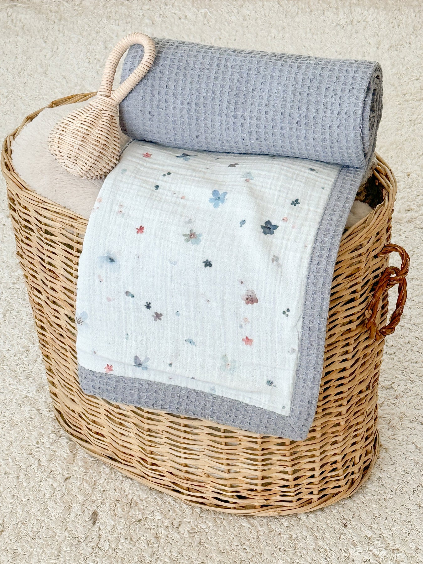 • One side features 100% cotton waffle, the other side is 100% cotton, 2-layer double gauze muslin — both breathable and baby-soft.