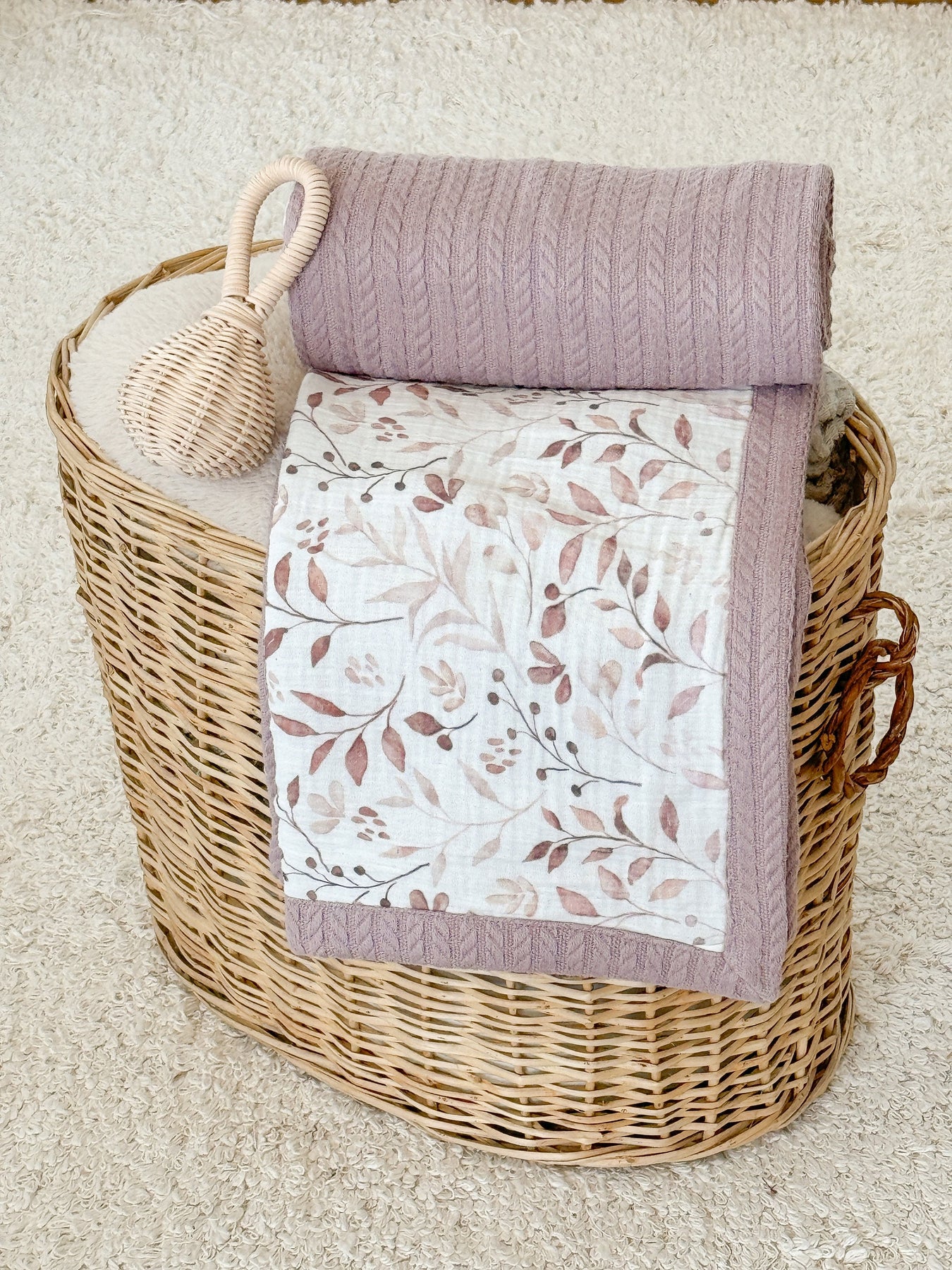 Personalized baby blanket with brownie leaves pattern by Cotton, folded with a mauve cable-knit blanket and wicker rattle in a basket.