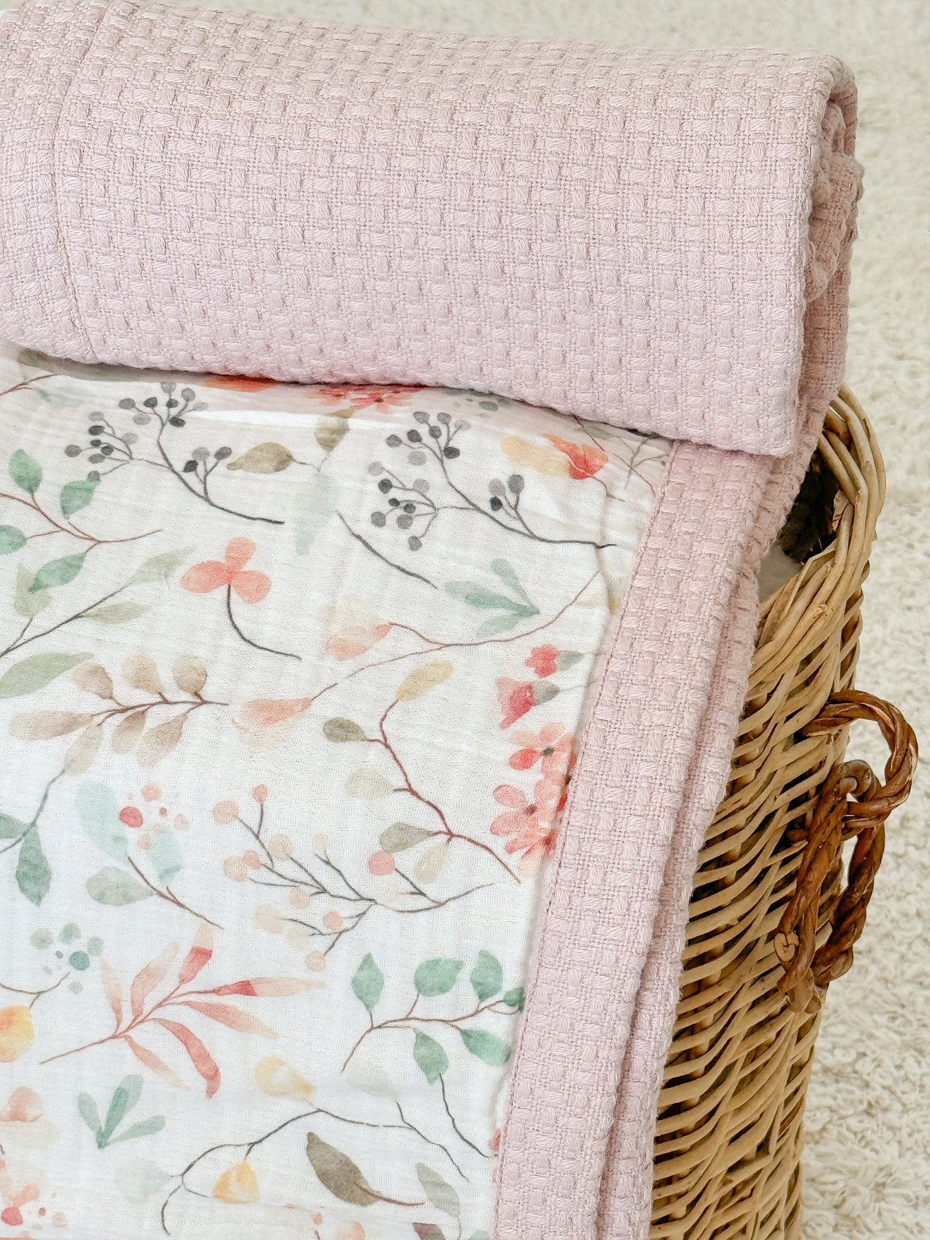 • One side features 100% cotton waffle, the other side is 100% cotton, 2-layer double gauze muslin — both breathable and baby-soft.